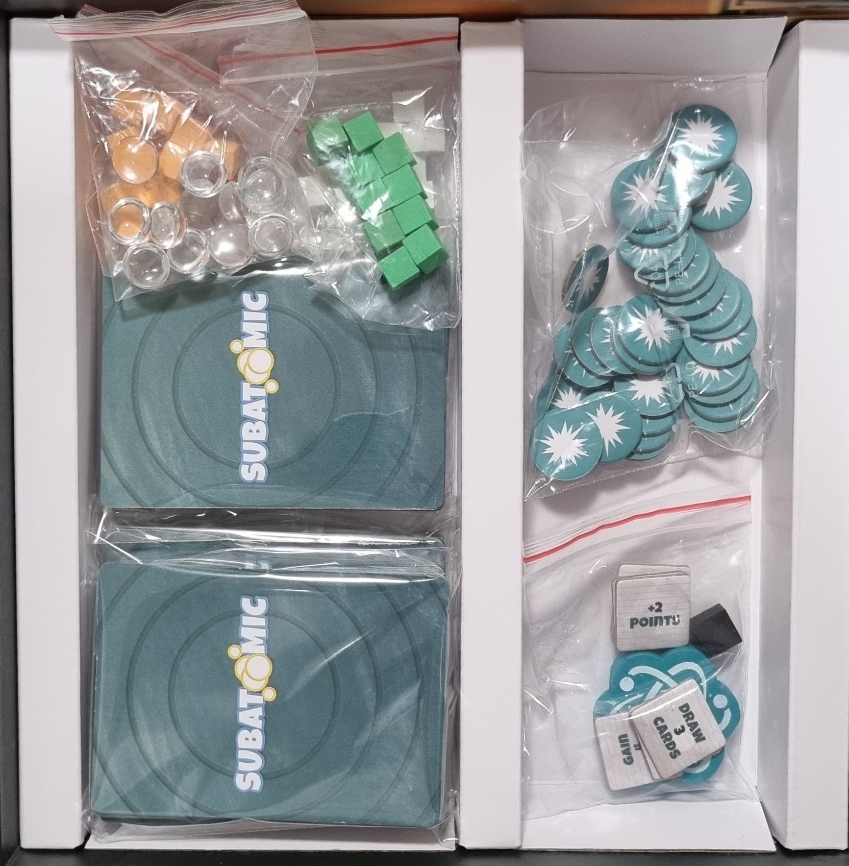 Subatomic: An Atom Building Game er et deckbuilding-spil, hvor spillerne konkurrerer om at bygge en række tilgængelige grundstoffer, som giver point.